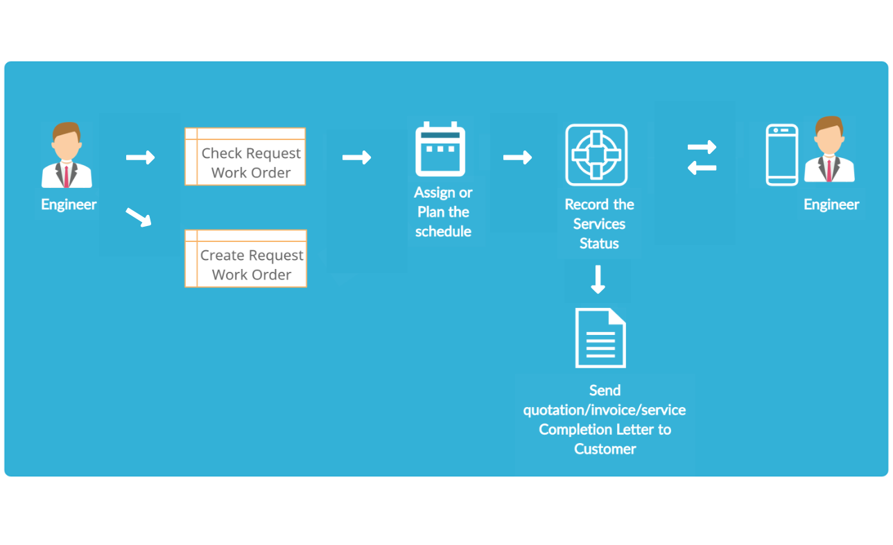 With our system, the engineer can either create or check request work order according to his permission and quotation can be sent to customer. He can plan the schedule and assign it to the other engineers. Then the assigned engineer can record the service status with mobile application. If the servicing is completed, our system can send invoice and service completion letter to customer.